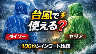 ダイソー・セリアのレインコート徹底比較:台風での実用性と賢い選び方ダイソーとセリアの100均レインコートの違いを比較。口コミ・評判、台風で使えるか、防水性・耐久性まで徹底解説。選び方と対策もまとめて紹介。台風が近づくと、「とりあえず100均...